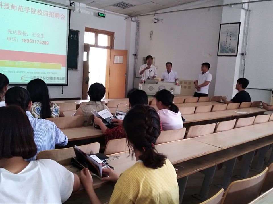 首先,由李佩忠老师为大家简单介绍了先达农业股份有限公司以及招聘人员。之后两位招聘人员介绍了山东先达农业公司的概况、优势、薪资待遇以及此次的招聘对象。公司成立于1998年,员工人数1100余人,其中研究生30多人。在葫芦岛有占地700亩的工厂,投入资金12.8亿,与南开大学、华中科技大学都有合作。该公司为一家上市企业,集原料、制作、销售为一体,可以为大家提供更多的就业选择。