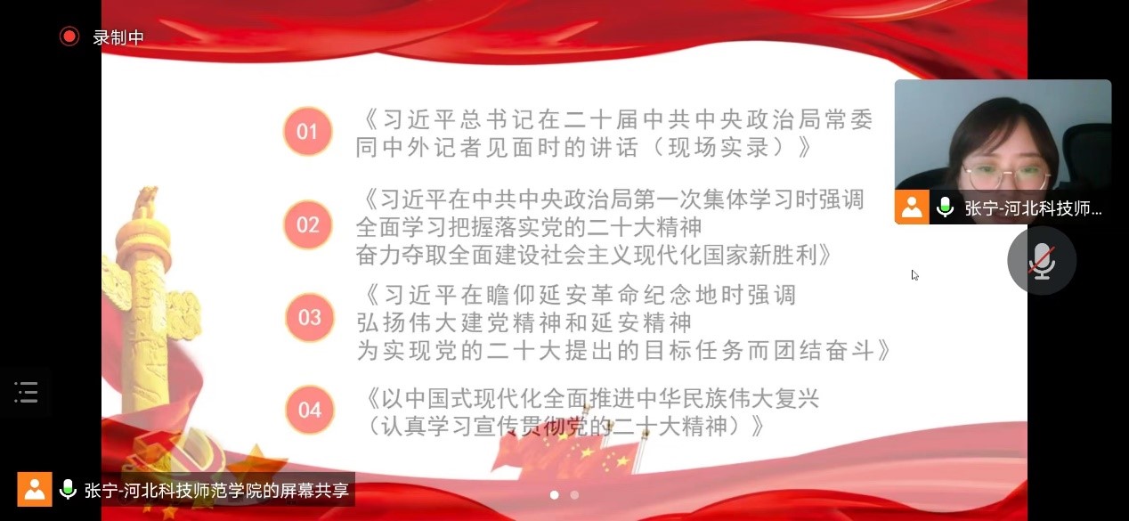 会议首先由张宁同志带领学习了党的二十大报告中提出的新思想、新战略、新要求;然后全体党员集体学习了《习近平总书记在二十届中共中央政治局常委同中外记者见面时的讲话》、《习近平在中共中央政治局第一次集体学习时强调 全面学习把握落实党的二十大精神 奋力夺取全面建设社会主义现代化国家新胜利》《习近平在瞻仰延安革命纪念地时强调 弘扬伟大建党精神和延安精神 为实现党的二十大提出的目标任务而团结奋斗》、《以中国式现代化全面推进中华民族伟大复兴》等四份重要讲话文件。学习结束后与会党员逐一发言讨论,一致认为站在新的历史起点,作为大学教师党员,党的二十大报告常学常新,每位党员都要提高政治站位,加强理论学习,不忘初心,做好立德树人的本职工作,在学习生活中做好员工的思想引领,为实现中国式现代化的中华民族伟大复兴事业贡献力量。