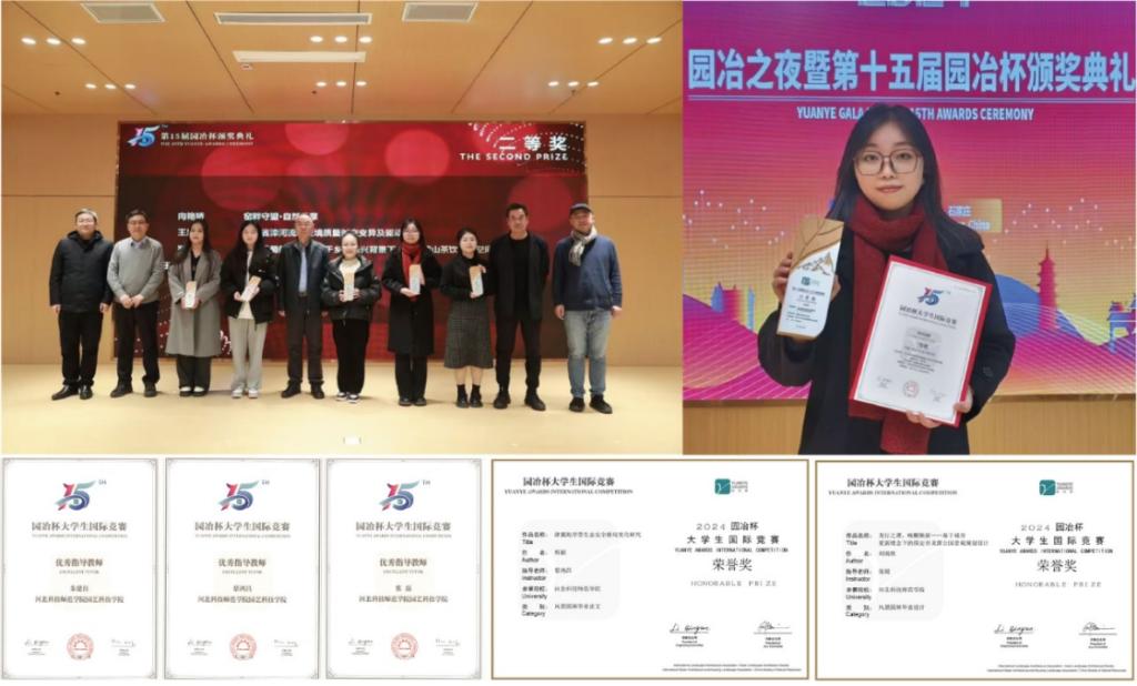 此外,刘雨欣(《龙行之潭,唤醒焕新——基于城市更新理念下的保定市龙潭公园景观规划设计》,由张锐指导)和韩颖(《津冀海岸带生态安全格局变化研究》,由蔡鸿昌指导)两位同学的参赛作品分别荣获本届园冶杯竞赛的毕业设计荣誉奖和毕业论文荣誉奖。公司和各位指导老师对竞赛的大力支持也获得了组委会的认可,将公司评为“第十五届园冶杯老员工国际竞赛先进教育集体”,并授予公司“第十五届园冶杯老员工国际竞赛优秀组织奖”,授予朱建佳、蔡鸿昌、张磊三位老师“优秀指导教师”奖。