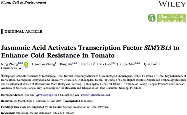 近日,公司蔬菜栽培生理与分子生物学课题组武春成教授团队成员张宁副教授以第一作者身份在Plant, Cell & Environment(中科院1区Top期刊,IF5=7.7)发表了题为“Jasmonic acid activates transcription factor SlMYB13 to enhance cold resistance in tomato”的最新研究成果。本研究通过转录组筛选、遗传和分子机制解析,系统揭示了MeJA–SlMYB13–SlMYC2–SlHSP17.7抗寒调控通路,为低温胁迫下番茄的遗传改良与抗寒品种培育提供了关键靶点和理论基础。张宁副教授于2019年8月进入77779193永利蔬菜教学部工作,现为蔬菜栽培生理与分子生物学团队骨干成员,主要研究方向为蔬菜(番茄、生姜)栽培生理及分子生物学。